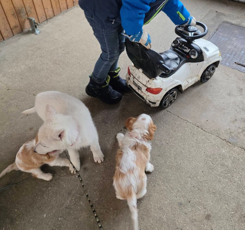 Ein besonderer Pluspunkt: Seit 10 Jahren führen wir eine Pferdezucht und seit einem Jahr auch einen Reitbetrieb. Unsere Hunde leben am Hof, wachsen mit Pferden und verschiedensten Menschen auf und sind dadurch bestens sozialisiert. Auch die Elterntiere genießen das Leben im Pferdebetrieb und begleiten uns mit Begeisterung bei Ausritten oder Kutschenfahrten. Diese enge Verbindung zu Tieren und Menschen schafft eine wertvolle Grundlage für ein ausgeglichenes und soziales Wesen.